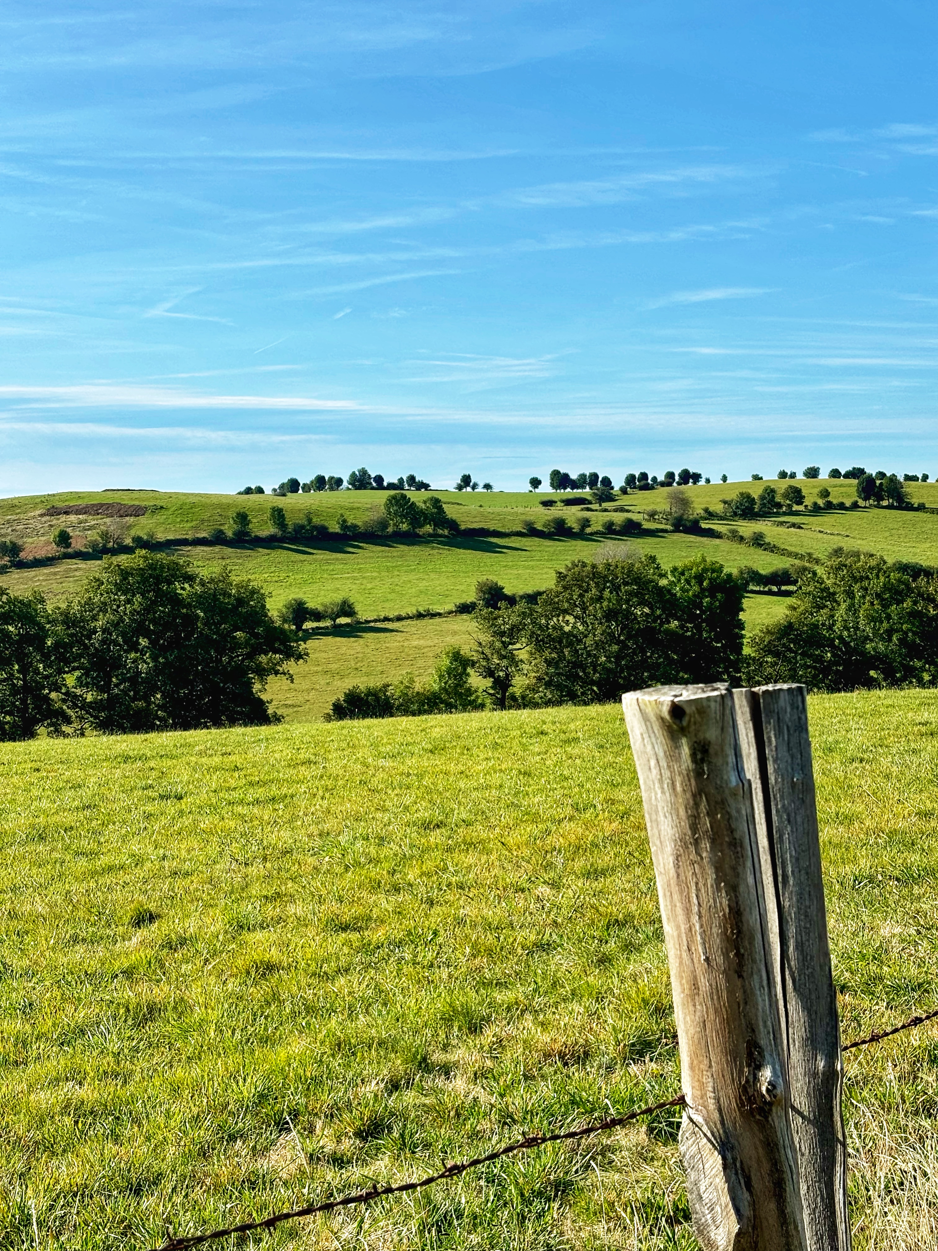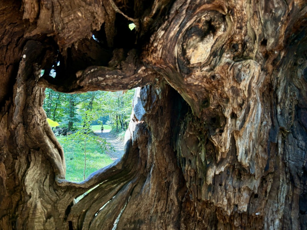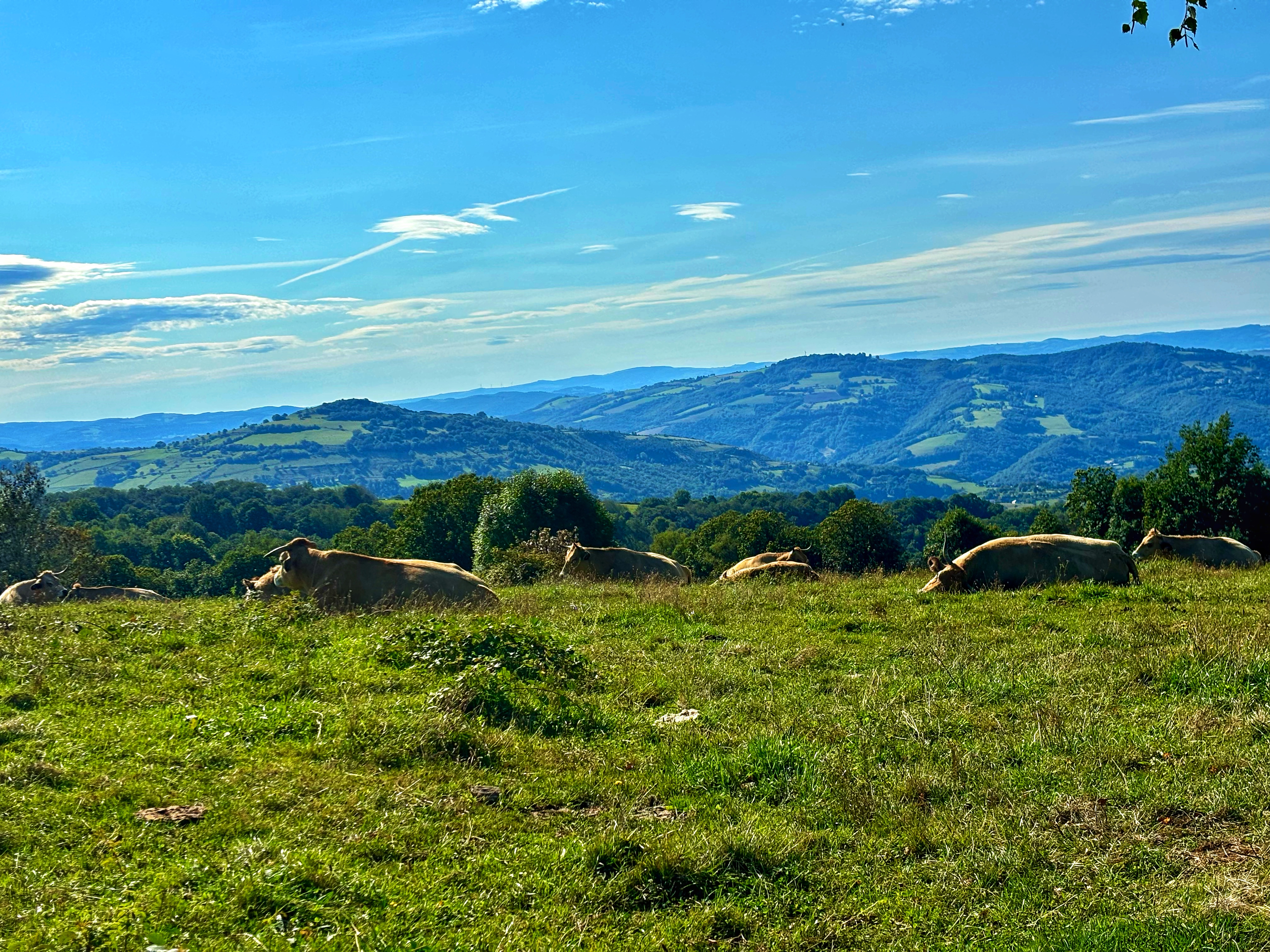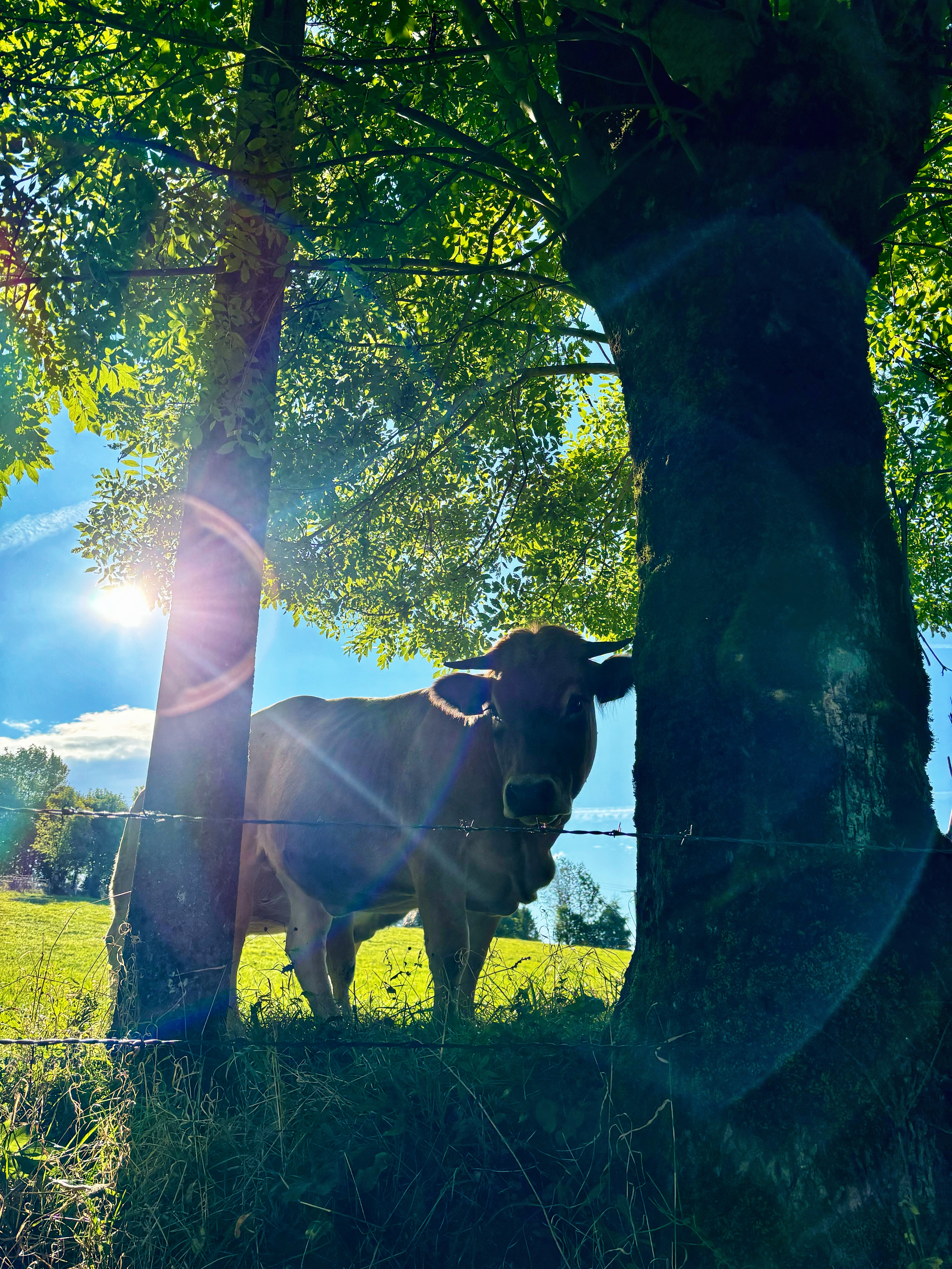 We were veiled by chestnut, acorn and oak trees, with their big foliage and twisted branch-work. Our guidebook was painfully accurate when it stated ‘just when you’re ready to drop into your destination, you will go up!’ – lots of false descents. There were frequent sweeping vistas and more cows.