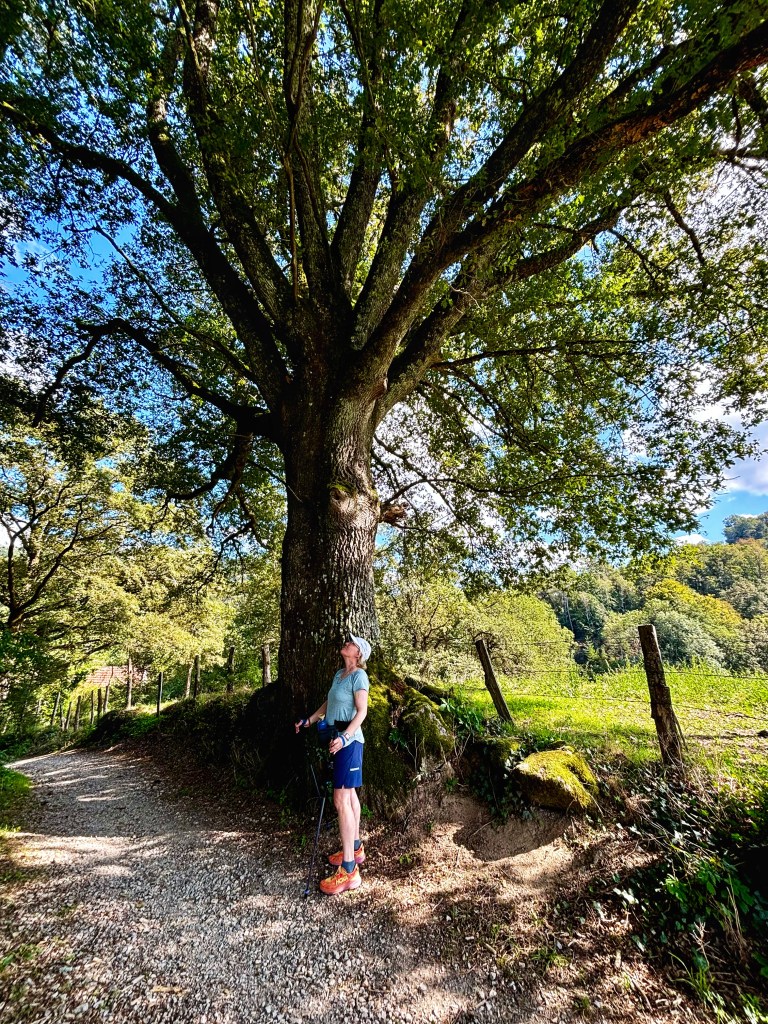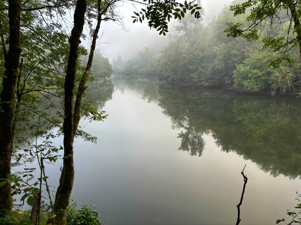 A pleasant outset, in the mist, again along the chestnut-lined Lot river, with only a sprinkling of associates along the way. We had a choice of 2 routes, one (supposedly) 18km roadside mixed with trails and the other, 19km purely countryside… roads aren’t so bad, right? Both had hills.