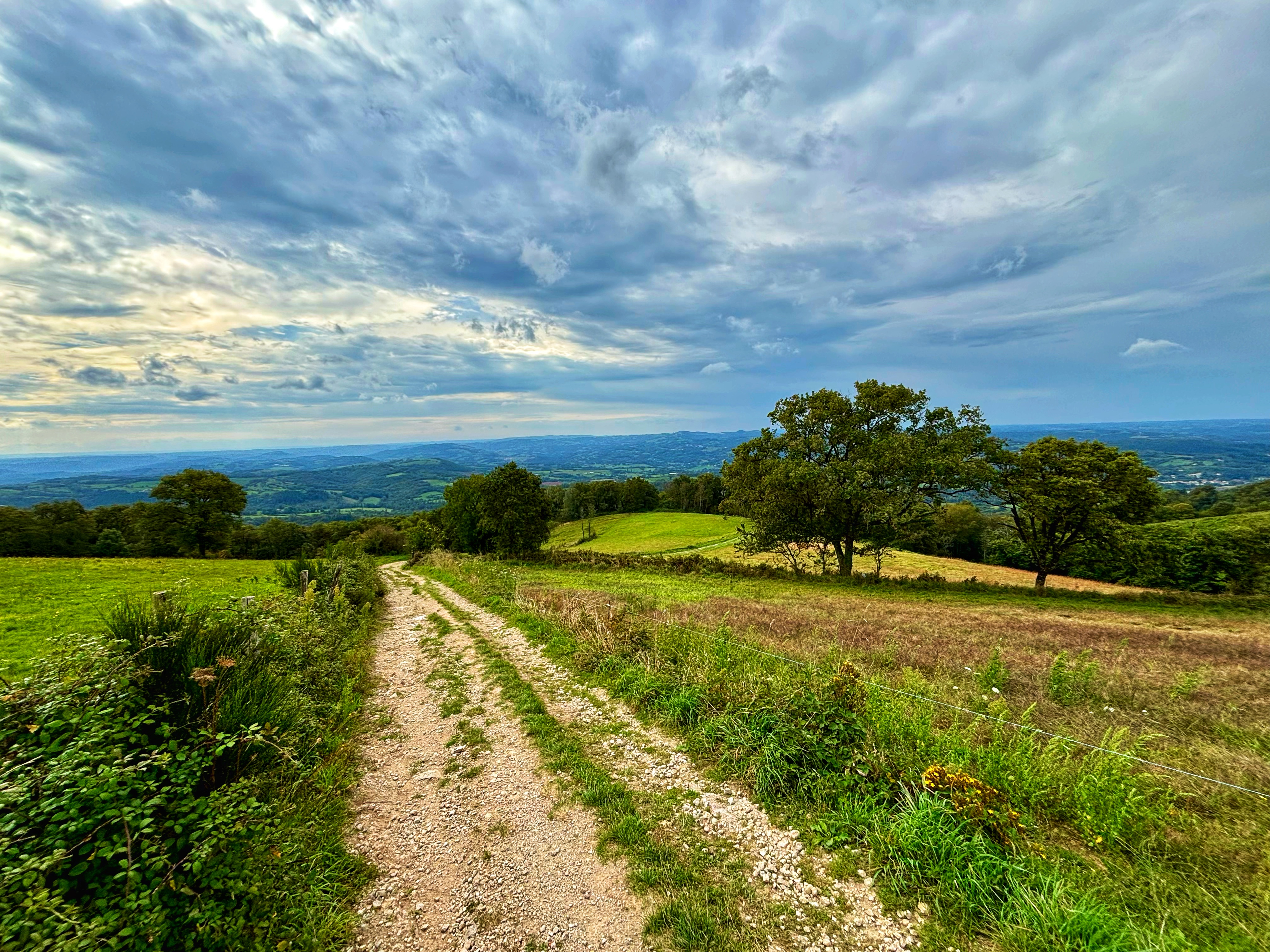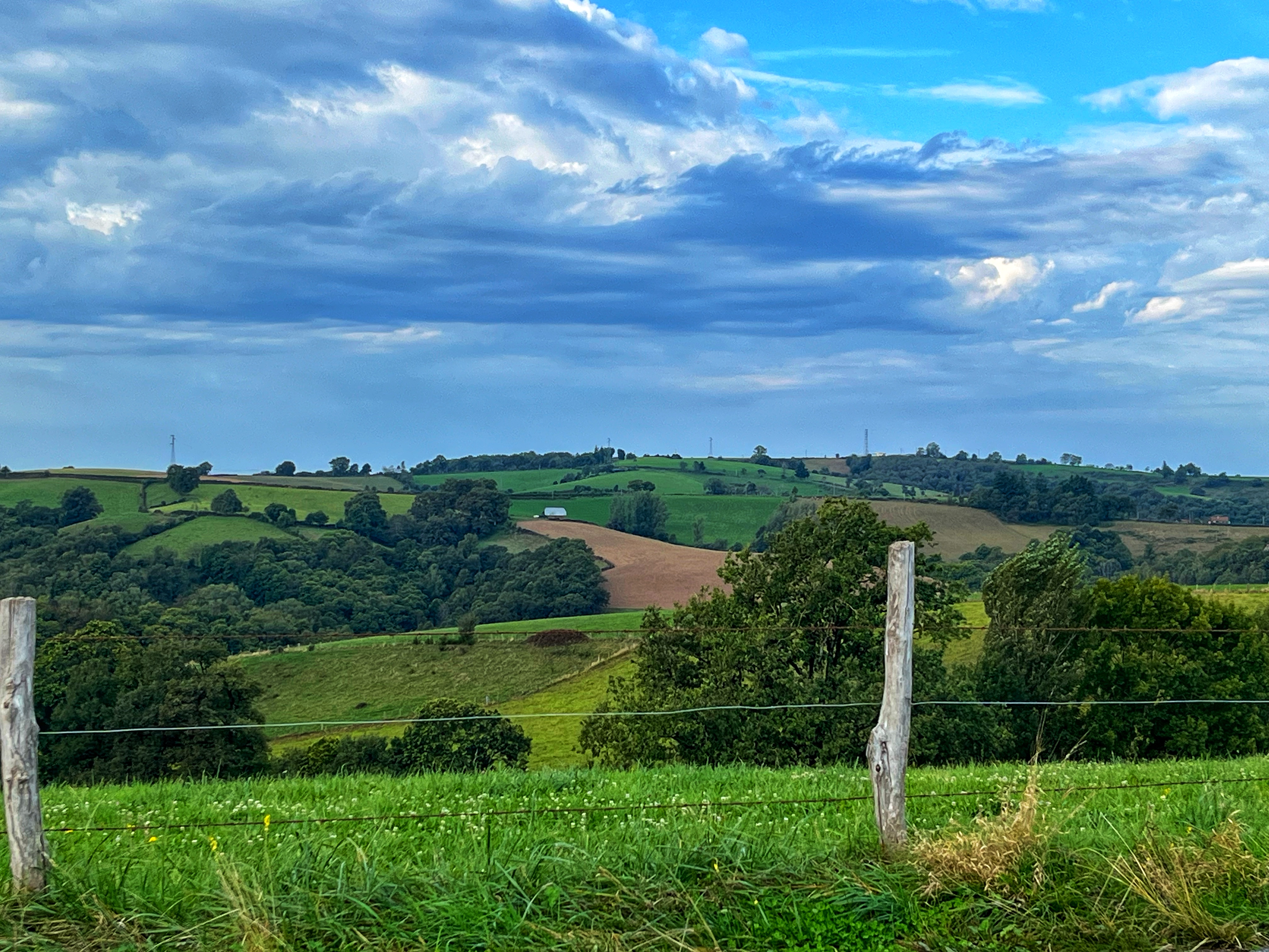Then it was along a ridge with typical expansive views of patchwork greenery, accompanied by the occasional cow or tractor. We were travelling light today, with both bags being transported onwards. When the skies turned leaden and a spritz of rain caught us, we realized that all our wet-weather gear was in them! The pace quickened.